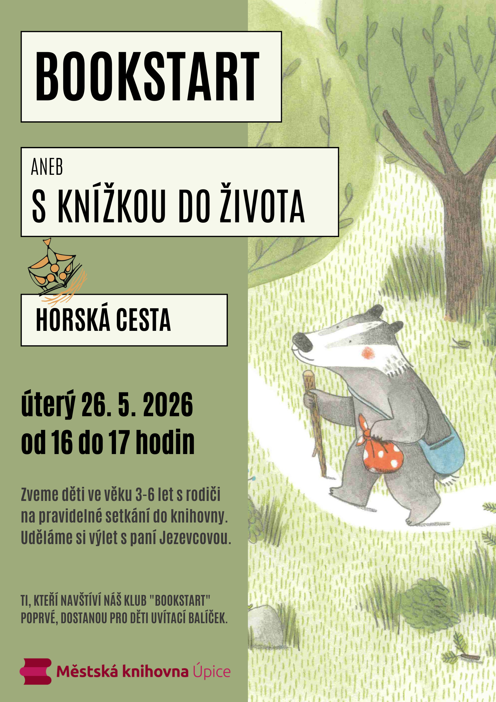 Milé maminky a tatínkové, srdečně vás zveme na další bookstart! Tentokrát se vypravíme na dobrodružný a zábavný výlet s paní Jezevcovou. Budeme si číst, hrát, trochu divočit a určitě si něco vyrobíme. Těšíme se na vás!