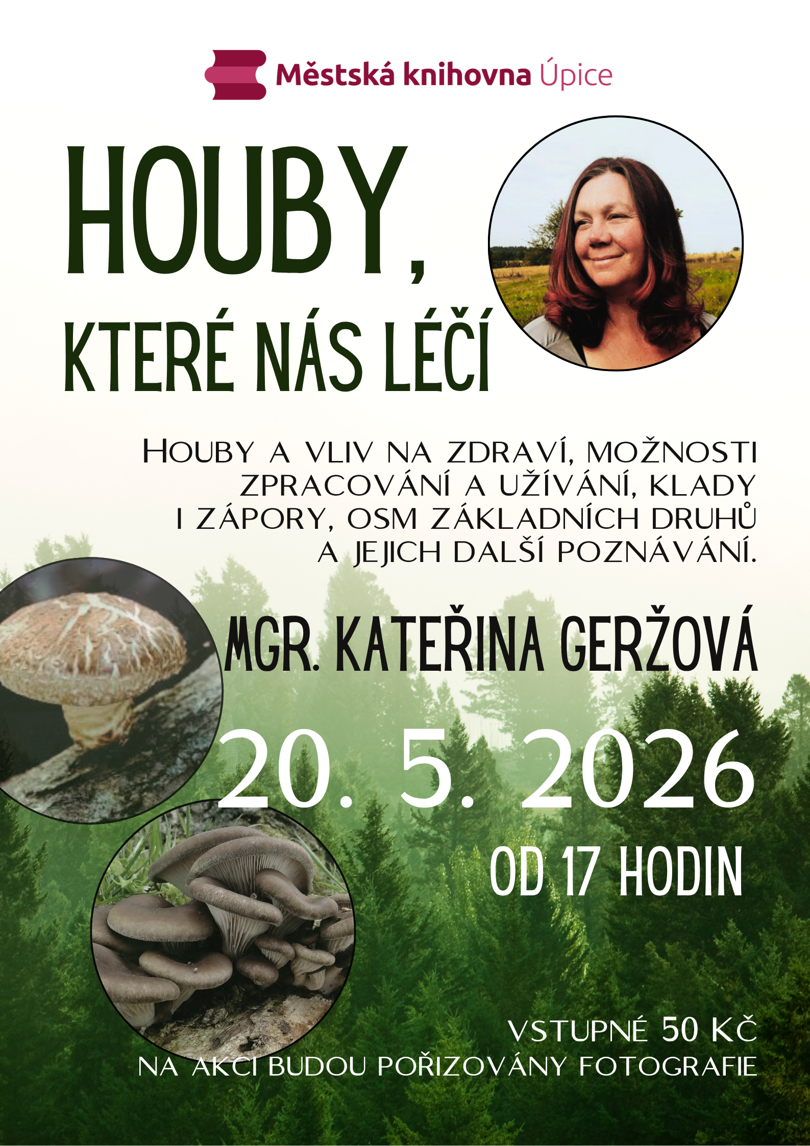 Milí čtenáři, zveme vás na přednášku s Mgr. Kateřinou Geržovou. Tentokrát si budeme povídat o houbách, jejich vlivu na zdraví, možnostech zpracování i užívání, dozvíte se klady a zápory, poznáte osm základních druhů hub a mnoho dalšího. Těšíme se na vás!